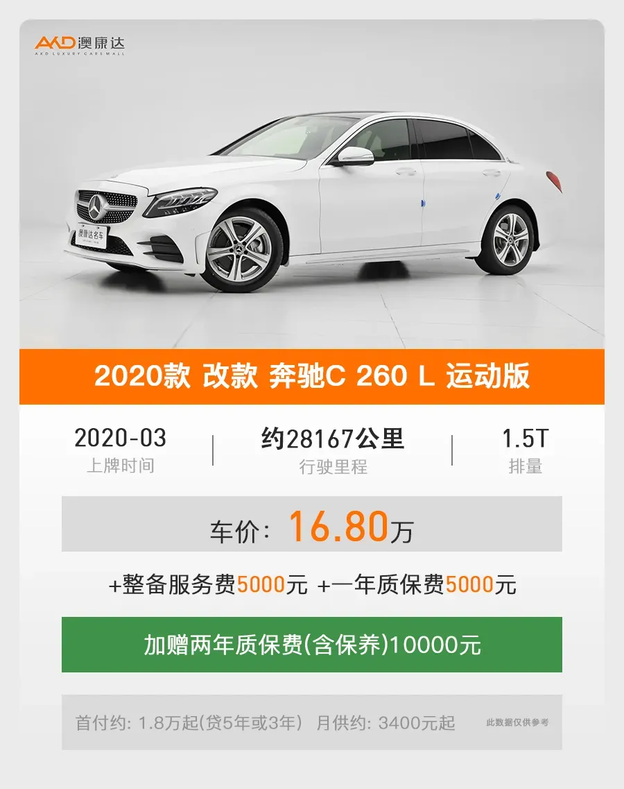 现在奔驰C级的二手车选择多且关键的价格很实惠,像澳康达二手车在售的这辆2020款 改款 奔驰C 260 L 运动版,属于上一代改款后的版本,也是主流销售的配置,白色车漆配上大标很时尚,黑色内饰也是百搭的配色,同时长轴距带来了更好乘坐氛围。
