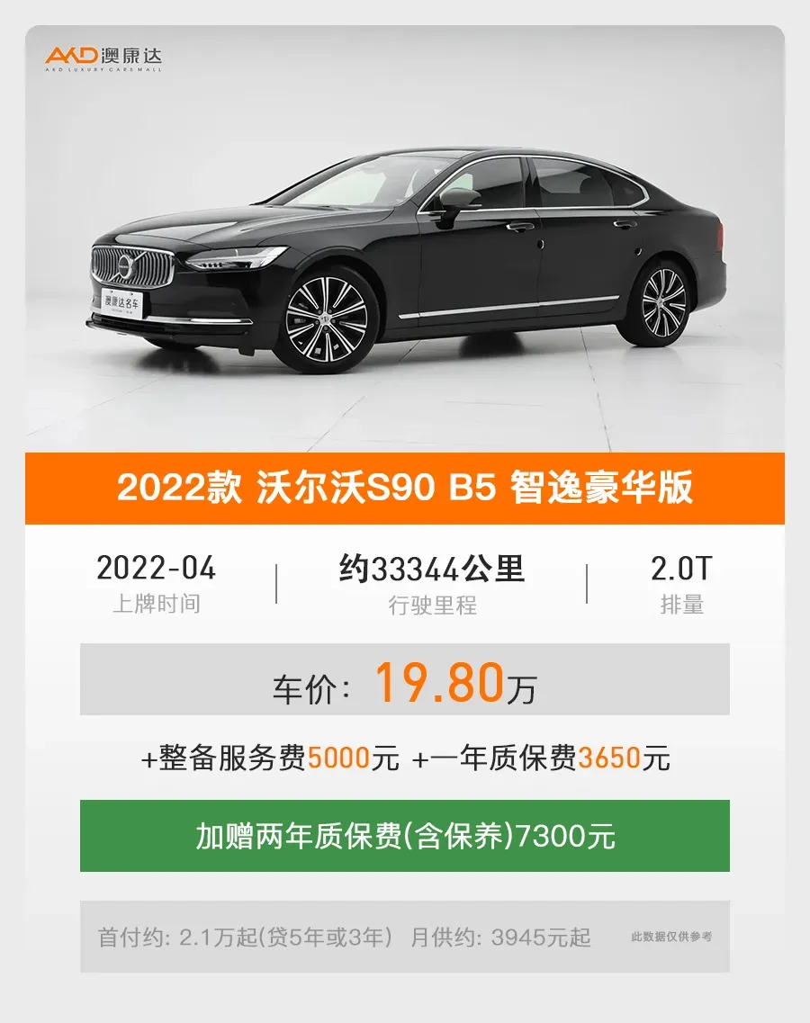 有别于前两台,沃尔沃S90的定位高一级,中大型级别,但是价格真香!像澳康达二手车在售的这辆2022款 沃尔沃S90 B5 智逸豪华版,入门配置,也是不少人的主流之选,2022年上牌行驶约3.3万公里,如今的二手车价还不到20万!