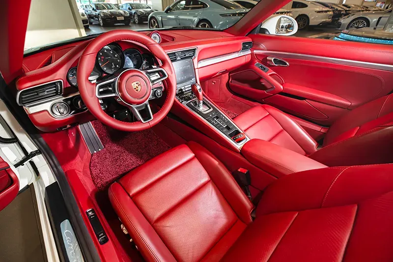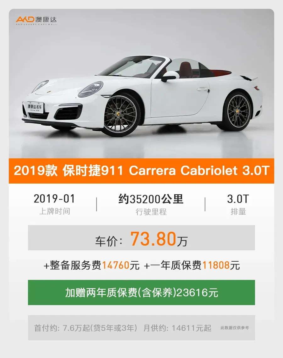 介绍这辆澳康达二手车是2019年上牌的保时捷911 Carrera Cabriolet 3.0T,属于入门配置的敞篷版911,3.0L水平对置六缸发动机,配上SC组件能做到3秒出头的加速,再加上出色的操控,男孩子很难不爱它!其选配约18万,有红色顶篷、波尔多红真皮内饰、助力转向升级版、运动型排气、BOSE音响等,行驶约3.5万公里,现在不到74万!