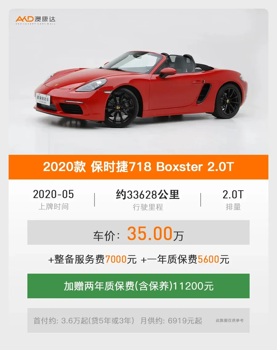 中置后驱的布局、小巧的车身,再配合上保时捷出色的调校,在操控性上它数一数二,无可厚非,虽然2.0T、250马力看着一般,但开过你就懂它的魅力!这部718 Boxster选配约8.6万,有黑色顶棚、助力转向升级版、64升燃油箱、黑色运动型尾管、加热多功能方向盘、BOSE音响等,2020年上牌行驶约3.3万公里,目前仅35万!