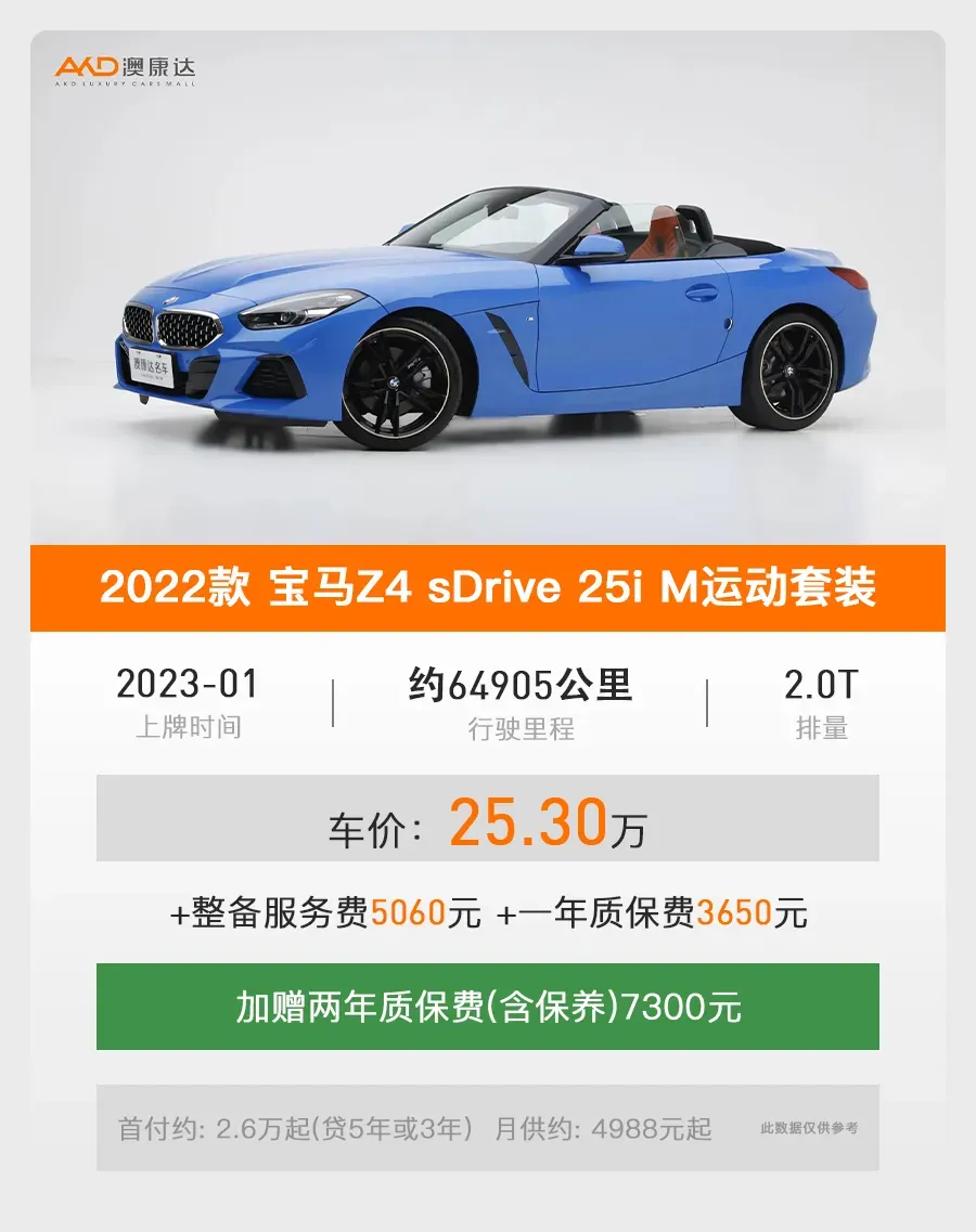 说到敞篷车领域,宝马还是有着不小的话语权,从3/15 PS到Z1,再到Z3,无不令人兴奋,而澳康达二手车在售的这辆2022款 宝马Z4 sDrive 25i M运动套装,属于是第三代产品,如果把前身Z3算上便是第四代了,极为优雅的设计配上宝马出色的运动性,便是大家喜爱的原因。