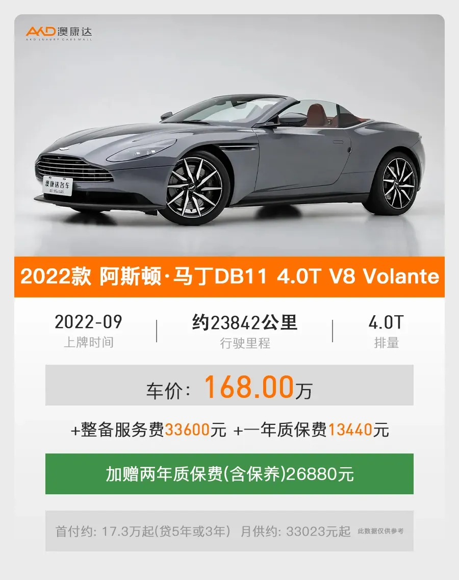 优美的外形之下,还藏着一颗大心脏,4.0T V8双涡轮增压发动机,534马力、675牛·米,4.1秒加速,它有躁动的一面,但亦是温文尔雅的绅士。这部DB11 Volante还选配了红色敞篷车顶、熏黑尾灯、20英寸高光黑钻石切割轮毂、车顶内衬高贵红等配置,2022年上牌行驶约2.3万公里,目前不到170万!