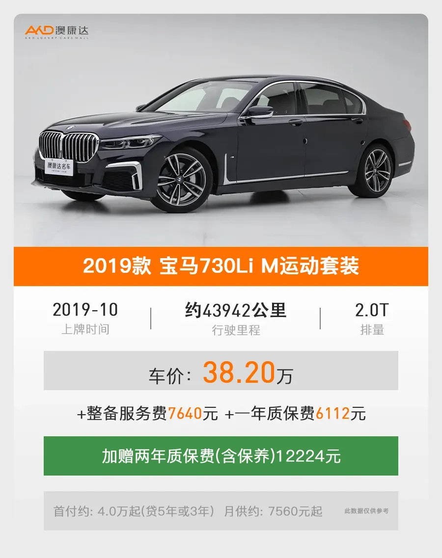 改款“大鼻孔”的7系现在30多万就能入手了,虽然新款5系更新,但7系的体验依然是旗舰级别,值得拥有,像澳康达二手车在售的这辆2019款 宝马730Li M运动套装,要不说它是730,大多数人是分辨不出它与740的差异,当然了,行政级车的气场那必须强大的。