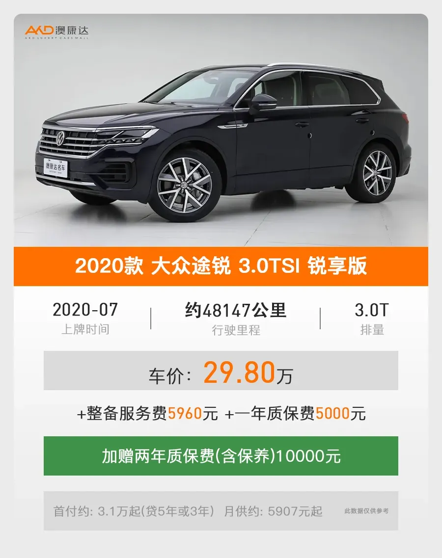 与宝马X5、奔驰GLE等车型同级别的大众途锐,亦是款实力座驾,澳康达二手车在售的这辆是2020款 大众途锐 3.0TSI 锐享版,也就是换代后的产品,其与兰博基尼Urus、保时捷Cayenne等超豪SUV均出自于大众集团下的MLB Evo平台,可见“出身就不平凡”了,而实际上它也确实很优秀。