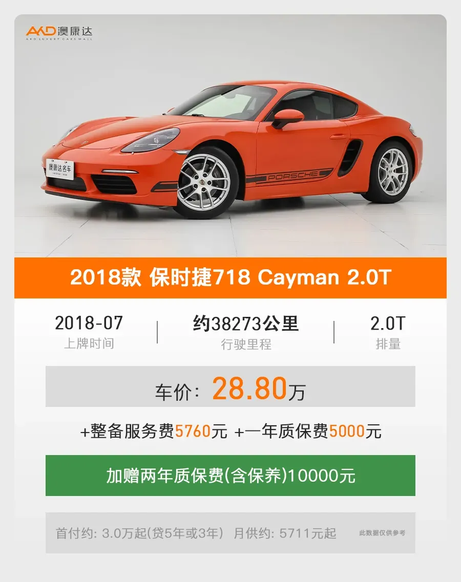 2.0T水平对置四缸发动机,250马力、5.6秒加速,看似一般实则让你爽快的,这得归功于保时捷那深厚的底盘调校功底,以及718那出色转向和优秀的动力系统,驾控层面没得说!这部718选配约7万,有倒车摄像头,PDLS Plus的LED主大灯、助力转向升级版、64升燃油箱等,2018年上牌行驶约3.8万公里,目前不到29万!